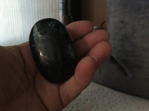 Unlike others, this astrophyllite palm stone combines tactile stress relief, safe warming for hot compress use, and a pocket-ready size so men get practical relief during work, travel, or workouts.